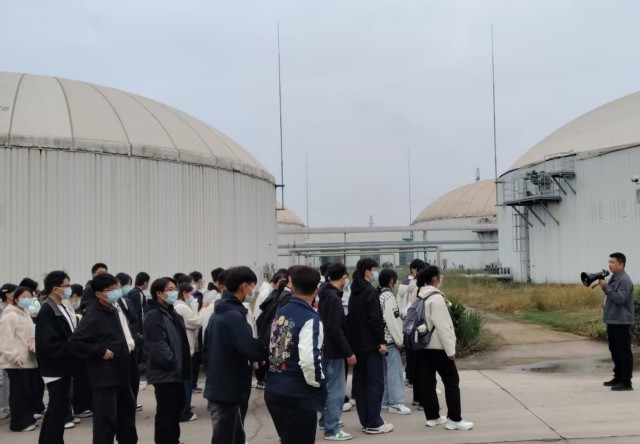 在國新公司相關(guān)負責人陪同下,師生們系統(tǒng)參觀了中控室、沼氣脫硫系統(tǒng)、厭氧發(fā)酵裝置、預處理車間、餐廚處理車間及沼液膜濃縮車間等關(guān)鍵工藝環(huán)節(jié)。針對學生的學科背景,講解人員聚焦智能化管控系統(tǒng)、環(huán)保處理工藝及機電設(shè)備的運行原理等內(nèi)容進行了深入講解,使同學們在真實的產(chǎn)業(yè)場景中,直觀感受到理論知識與工程實踐的深度融合,進一步激發(fā)了專業(yè)研習熱情與職業(yè)方向認同。