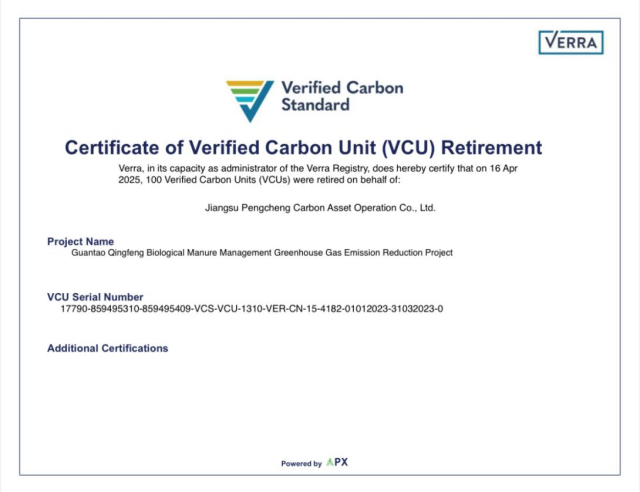 江蘇彭城碳資產(chǎn)運(yùn)營(yíng)有限公司已通過(guò)購(gòu)買(mǎi)國(guó)際自愿減排(VCS):館陶縣慶豐生物科技有限公司糞便管理溫室氣體減排項(xiàng)目,用于活動(dòng)能耗和包括參會(huì)者們?cè)诨顒?dòng)中產(chǎn)生的二氧化碳當(dāng)量溫室氣體排放,實(shí)現(xiàn)活動(dòng)碳中和。