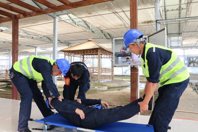 14時(shí)35分,刺耳的警報(bào)劃破寧靜,觸電搶救應(yīng)急演練率先登場。四名電站運(yùn)維員工組成的應(yīng)急小組迅疾響應(yīng),嚴(yán)格按照預(yù)案流程行動。只見一人果斷切斷電源,另一人利用絕緣桿將“觸電者”安全脫離危險(xiǎn)區(qū),其余隊(duì)員立即上前進(jìn)行規(guī)范的心肺復(fù)蘇急救。整個(gè)過程緊張有序,展現(xiàn)了團(tuán)隊(duì)在突發(fā)險(xiǎn)情中的高效協(xié)作與過硬技能。演練結(jié)束,安全專家即時(shí)點(diǎn)評,對脫離電源的技術(shù)要點(diǎn)與心肺復(fù)蘇操作標(biāo)準(zhǔn)進(jìn)行強(qiáng)化講解,切實(shí)提升現(xiàn)場人員的應(yīng)急實(shí)戰(zhàn)能力。